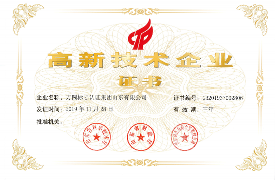 时间:2020年04月23日 方圆山东公司被认定为2019年山东省第一批国家级高新技术企业。2020年4月17日,方圆山东公司取得了由山东省科技厅、山东省财政厅、国家税务总局山东省税务局联合颁发的《高新技术企业证书》。