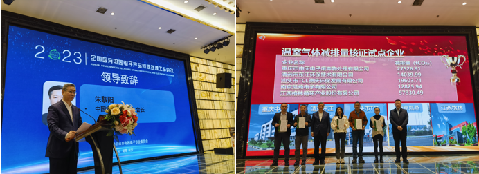 方圆集团绿色低碳事业部相关技术专家参加会议,与中国循环经济协会领导共同为9家废电器电子产品回收处理试点企业颁发了GHG减排量核证证书;并就废弃电器电子产品回收处理项目碳减排核算、产品/场所/组织循环指数评价工作进行了介绍交流。