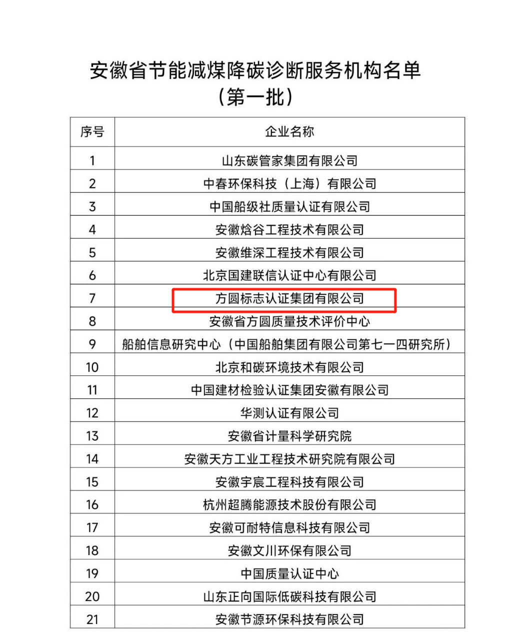 根据《安徽省发展改革委完美体育·(中国)官方网站-365WM SPORTS征集安徽省节能减煤降碳诊断服务机构和合同能源管理合格供应商的通知》要求,经专家评审,方圆标志认证集团成功入选安徽省节能减煤降碳诊断服务机构名单(第一批)。