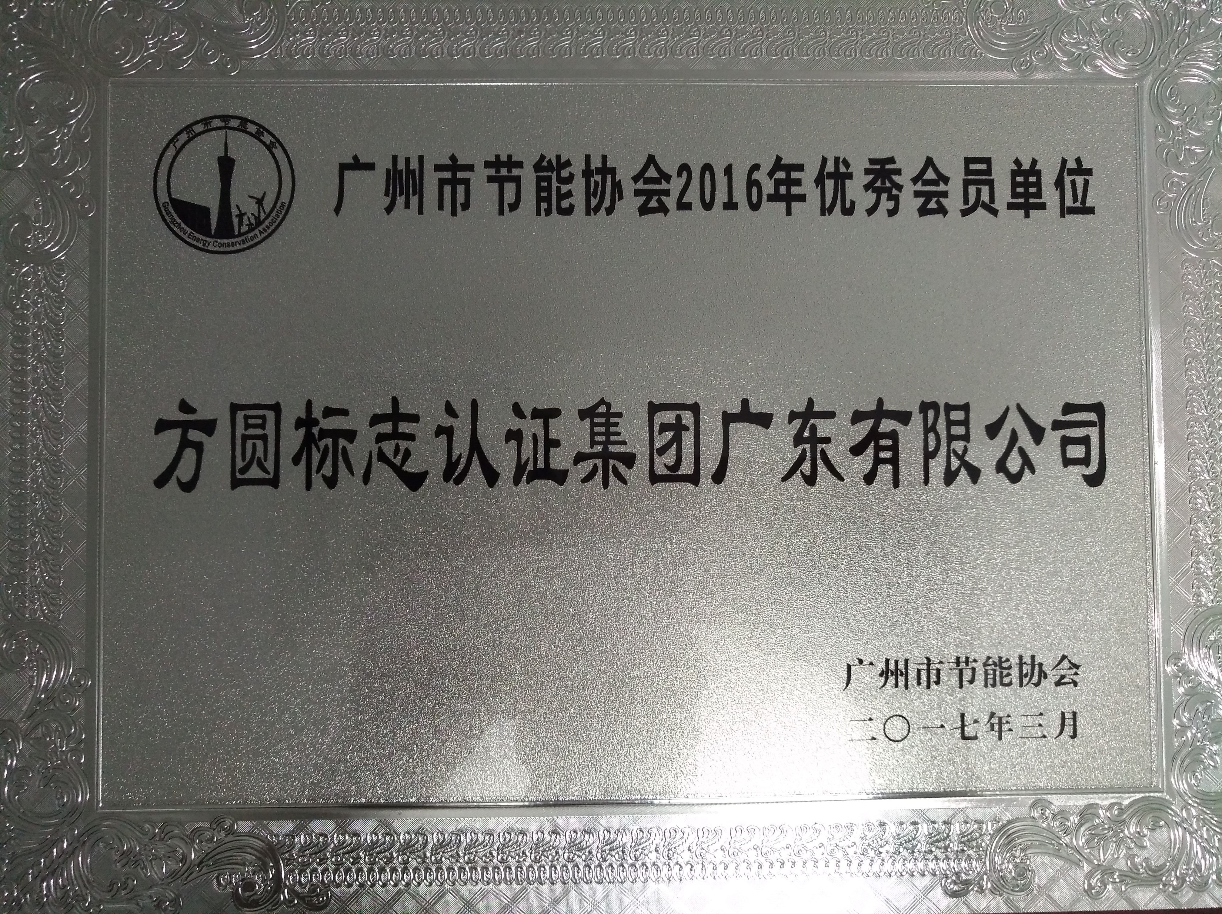 方圆广东公司荣获广州市节能协会2016年优秀会员单位