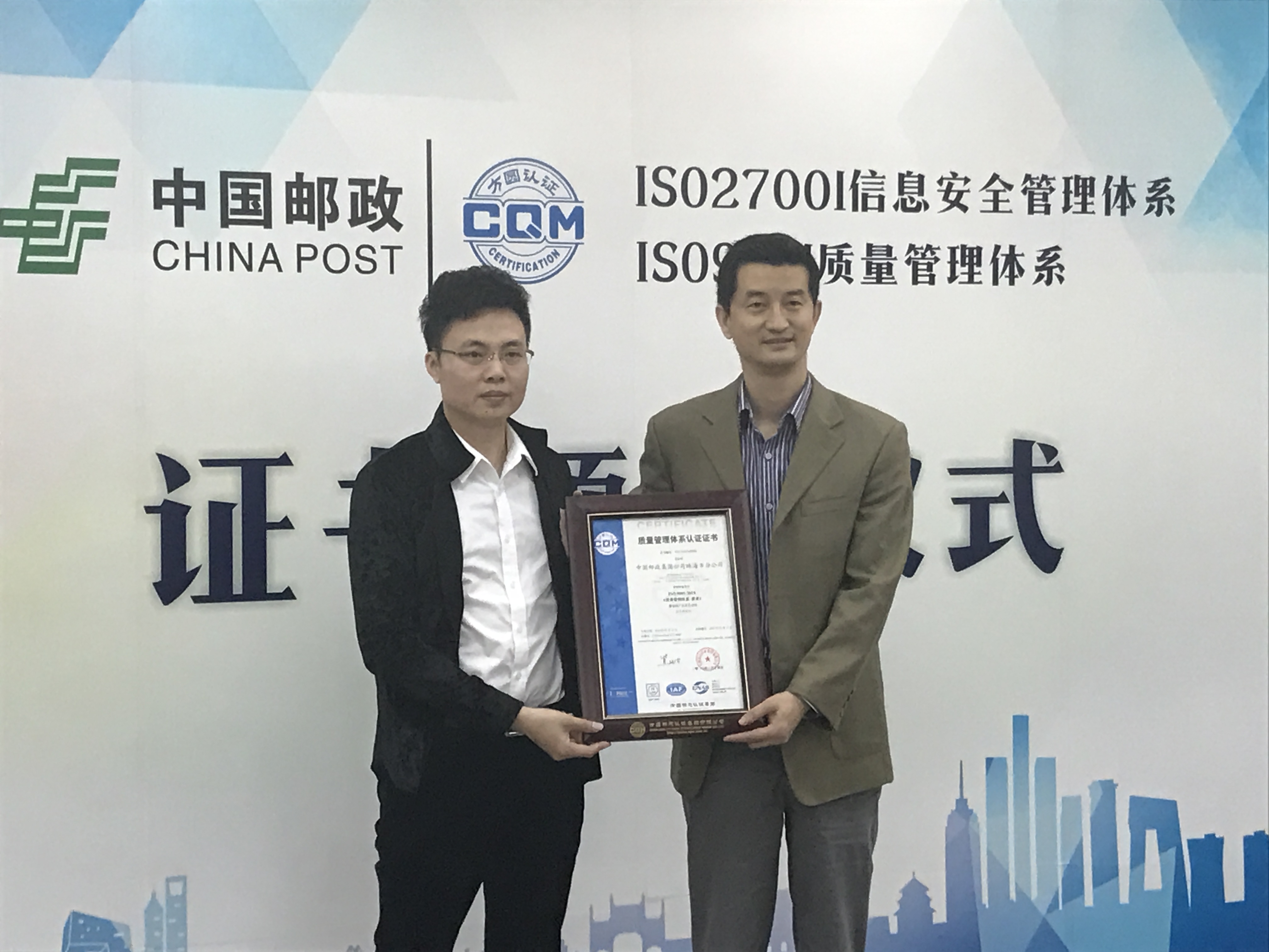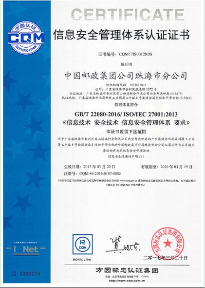 3月31日上午,中国邮政集团珠海市分公司认证证书颁发仪式隆重举行。方圆广东公司张耿彬副总经理带领工作团队出席仪式,为中国邮政集团珠海市分公司颁发了ISO27001信息安全管理体系认证证书及ISO9001质量管理体系认证证书。