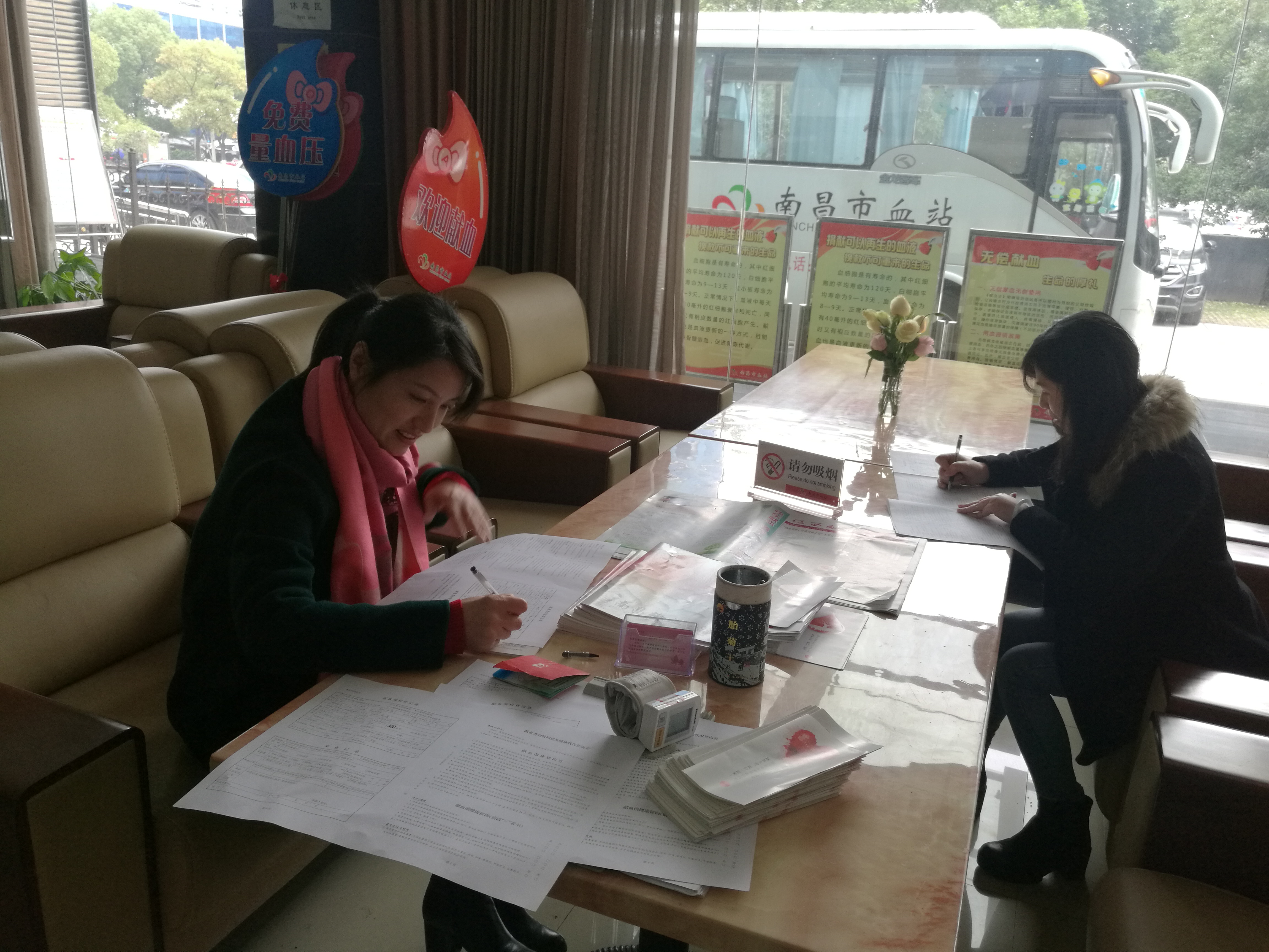 公司员工在工作人员的指导下,认真填写献血登记表、测量血压
