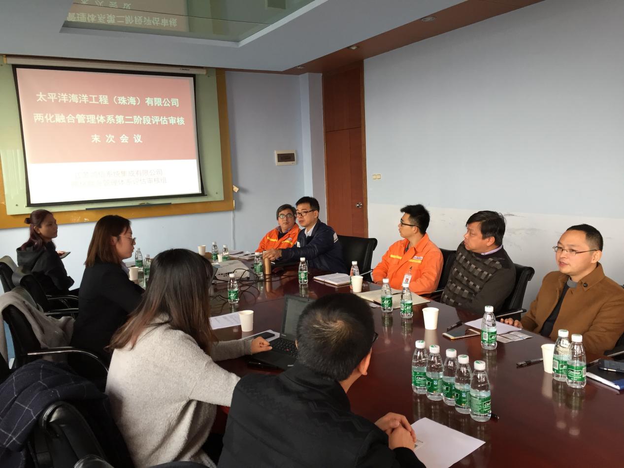 珠海市斗门区科技和工业信息化局向杨副局长,方圆广东公司陈明东副总经理、研发应用部赵喜柱部长参加了本次评定的末次会议。评审组对太平洋海洋工程(珠海)有限公司的两化融合管理体系给予了肯定,确认了两化融合管理体系符合性和有效性,同时对期管理体系的后续工作提出了改进的要求。