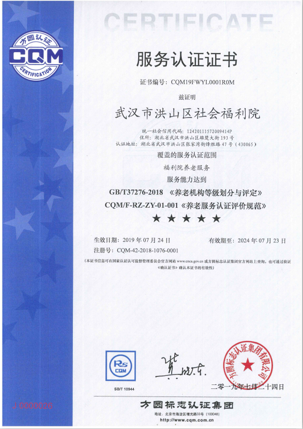 热烈祝贺方圆湖北公司客户武汉市洪山区社会福利院获得方圆集团首张5星级新版标准养老完美体育·(中国)官方网站-365WM SPORTS 证书