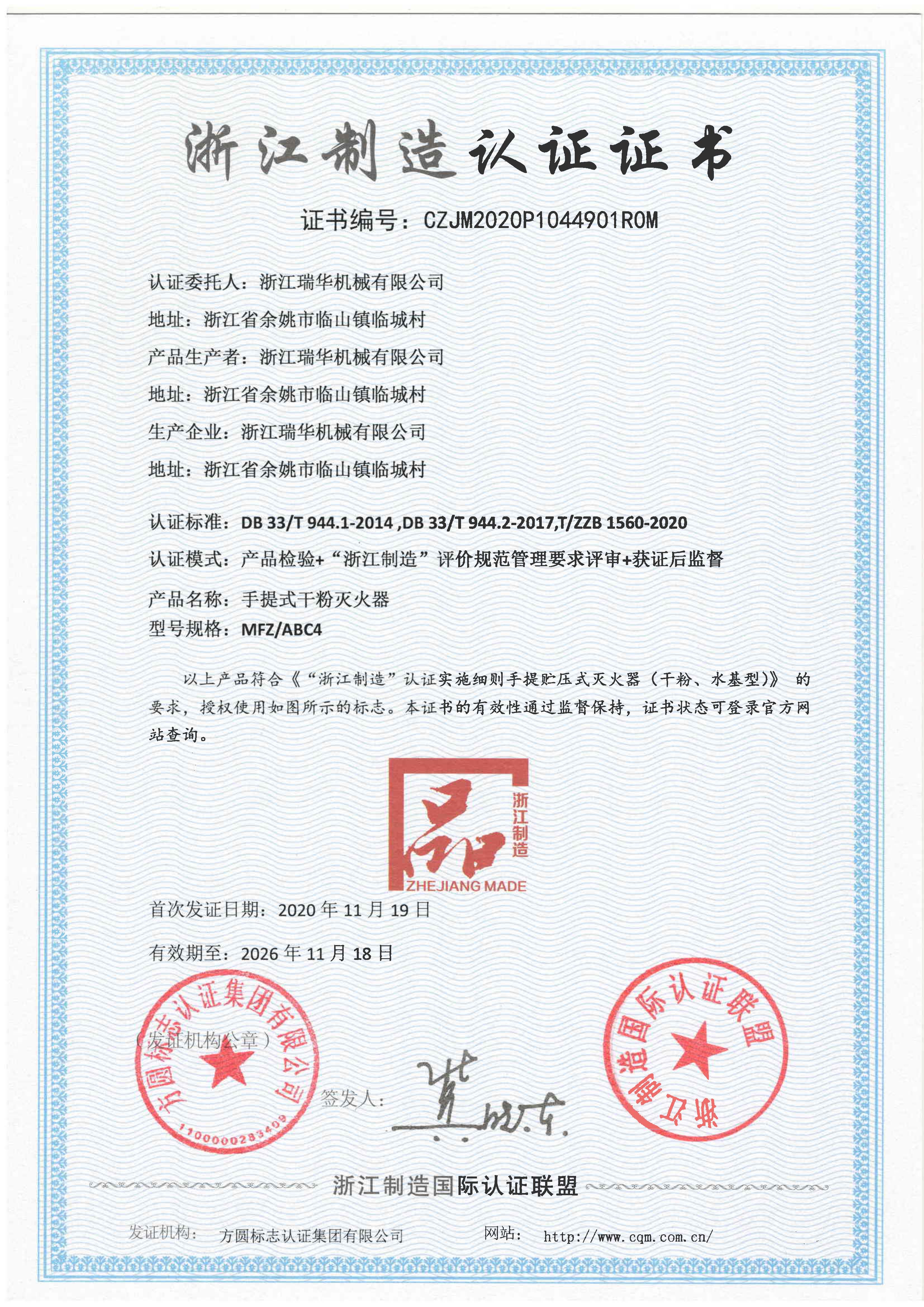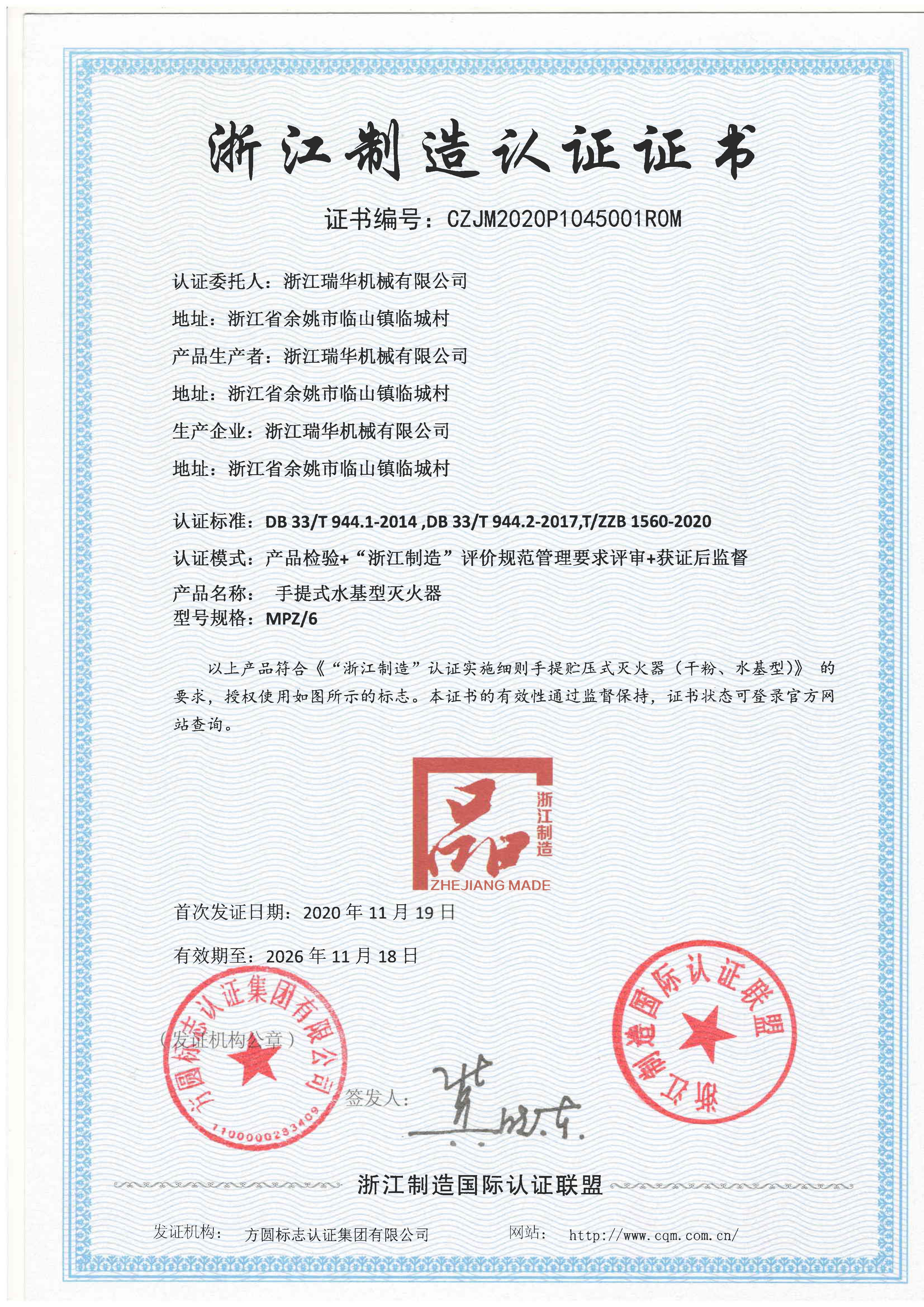 时间:2020年11月30日 2020年11月19日,方圆浙江公司为浙江瑞华机械有限公司颁发了手提式干粉灭火器和水基手提式灭火器两个产品的“浙江制造”认证证书。这是浙江省灭火器制造行业第一家获得“浙江制造”认证证书的企业。