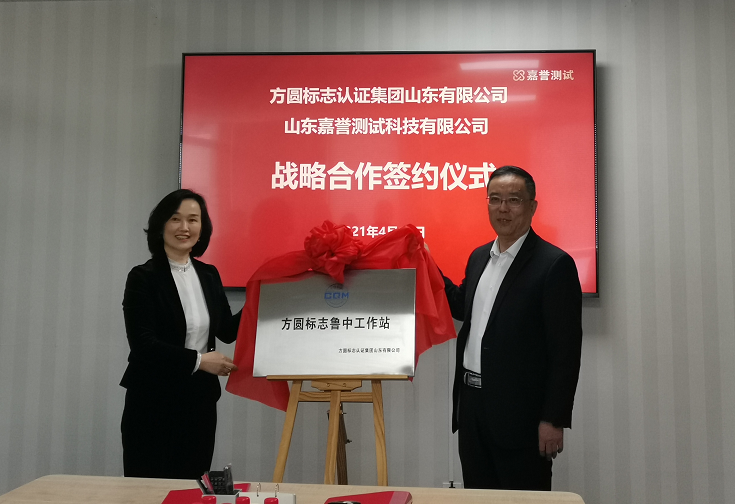 揭牌仪式前,方圆标志认证集团山东有限公司和山东嘉誉测试科技有限公司签署了战略合作协议,方圆山东公司副总经理马书哲、嘉誉测试科技集团副总经理王强代表双方签署协议,双方总经理及部分工作人员见证了签字仪式。