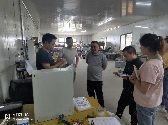 通过对企业的电气车间、生产车间、样品车间、激光切割车间等车间的实地参观和对工人的询问沟通了解。岳老师对企业的原料以及产品的检测、企业的工艺规程等现场提出了具体的整改意见。