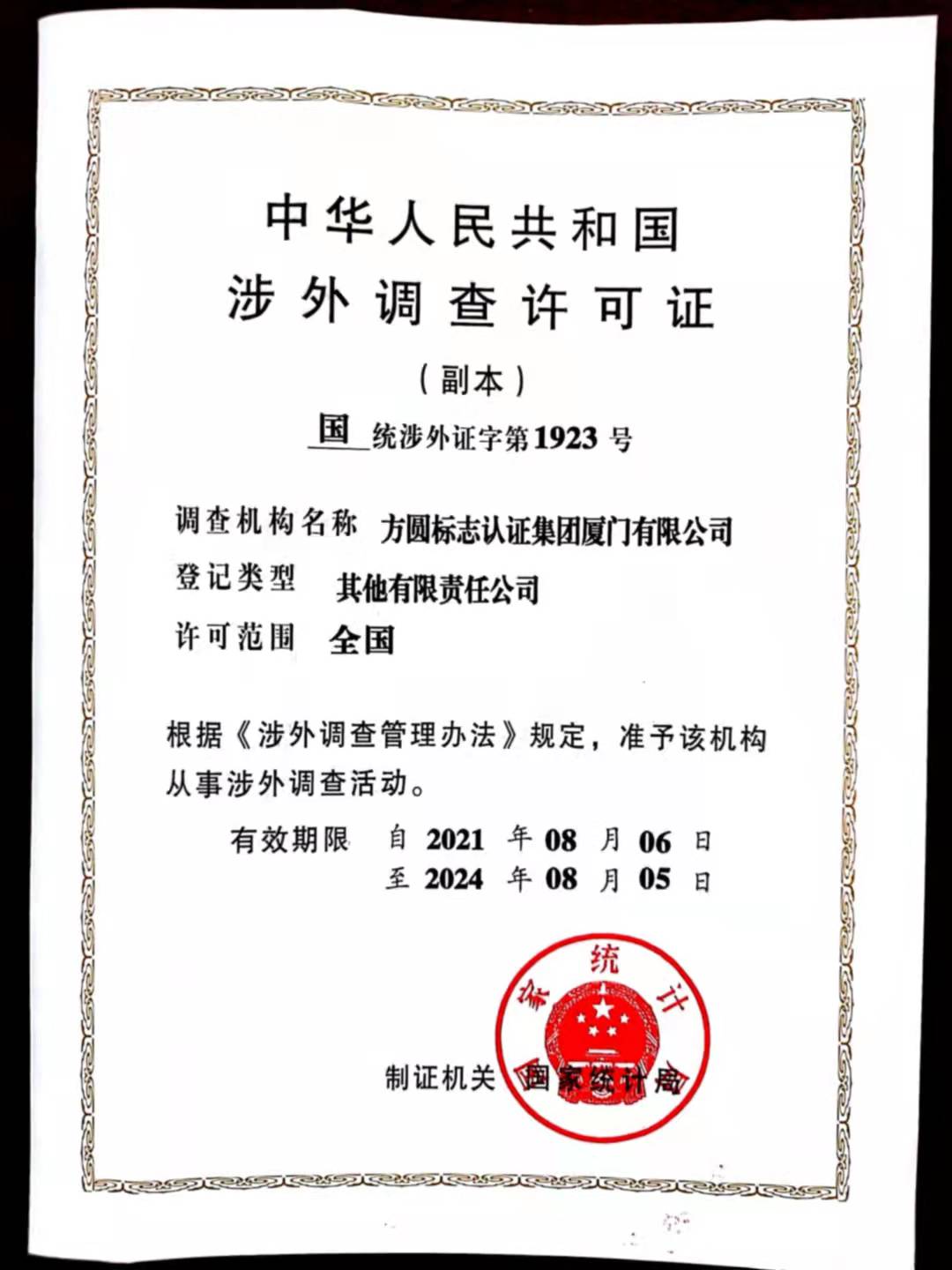 金秋时节,丹桂飘香。近日方圆厦门公司喜获涉外调查许可证,标志着方圆厦门公司在社会调查、行业调查、市场调查、企业调查、数据采集研究等方面的综合服务能力获得国家主管部门的认可。