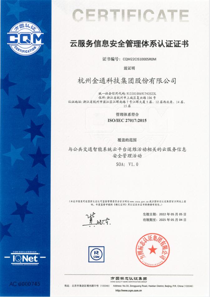 金通科技始创于2009年,由杭州公交集团控股,涵盖智能化软硬件开发、建设及整体运营服务,业务聚焦智慧单车、智慧公交和智慧停车,并以5G、云计算、大数据、AI等技术为驱动,为城市提供高品质、全方位的公共交通服务,让低碳理念深入人心,成为国内领先的公共交通全域数字化一站式解决方案提供商。基于自我要求及为外部提供信任的需求,杭州金通科技集团股份有限公司向我司提出了进行ISO/IEC 27017:2015云服务信息安全管理体系的认证申请。