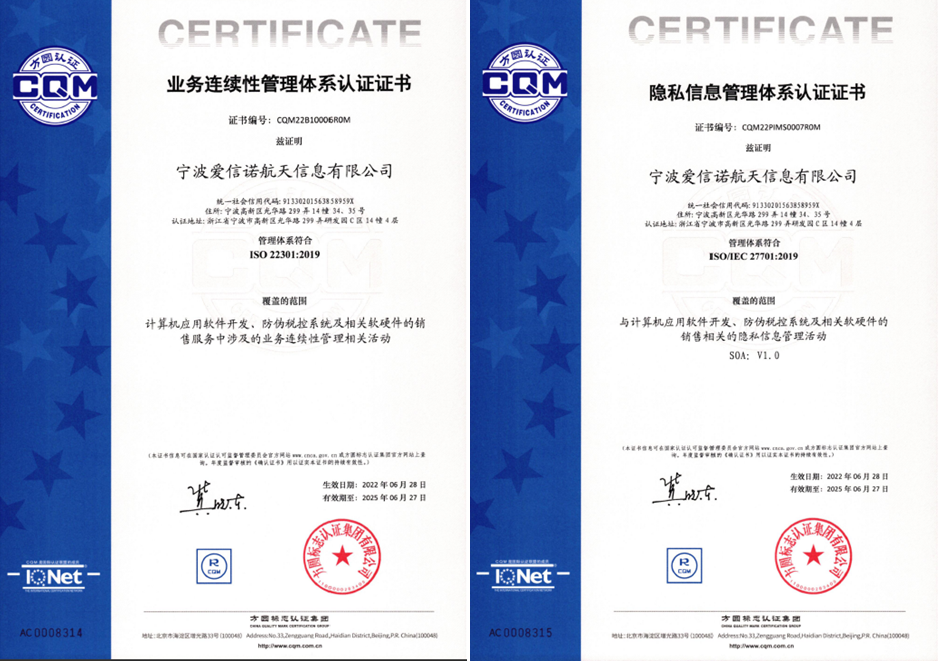 宁波爱信诺航天信息有限公司成立于2010年10月,致力于计算机系统应用的开发、推广与服务。公司将金税、金融与物联网做为三大支柱产业提供企业信息化、IT服务、财税培训、通用产品销售等技术服务。2021年7月宁波爱信诺航天信息有限公司导入业务连续性管理体系(BCMS)、隐私保护管理体系认证(PIMS),通过对两个管理体系标准的认真学习,近一年的运行、实施,公司于2022年6月顺利通过认证。企业代表在通过认证时说,通过这两个体系的导入,让客户对他们托付的金税盘技术服务,更放心,更安心。