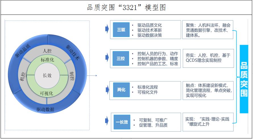 三驱:聚焦全局思维,从人机料法环等五个方面融会贯通,采取调研、论坛等方式抓取小微企业、行业协会、检验机构、认证机构等“多脑”数据,聚力增效,数字赋能发现小微企业质量共性问题,寻求技术改进空间,倒推质量管理短板,从全局角度多方位思维,构建小微企业质量管理体系建设的品质文化,真正做到管理驱动是基石,技术驱动是助攻,数据驱动是新引擎。
