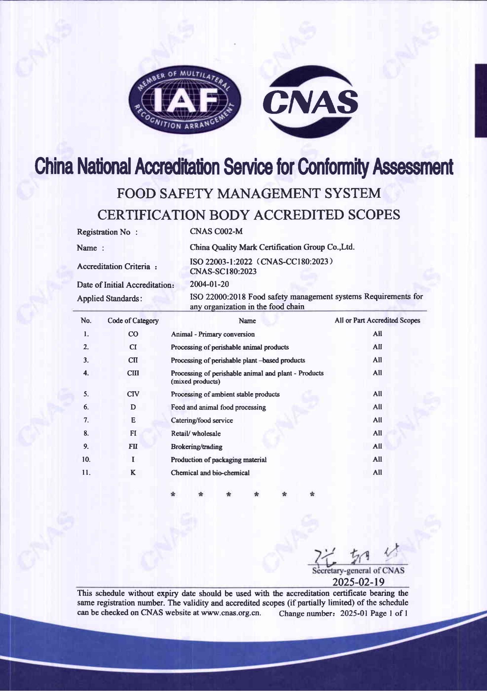 食品安全管理体系认可证书