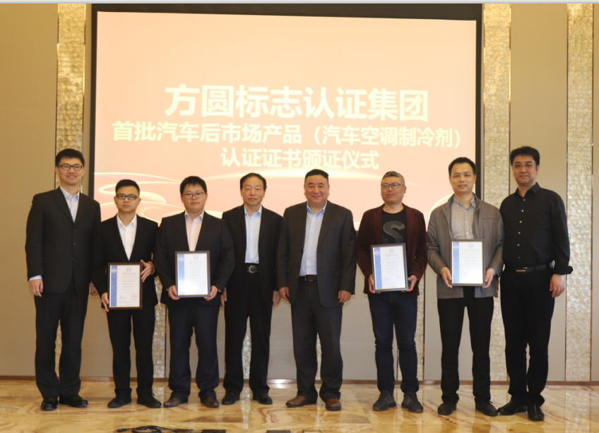 浙江衢州联州致冷剂有限公司、浙江三美化工股份有限公司、中化近代环保化工(西安)有限公司、广州市标榜汽车用品实业有限公司(企业排名不分先后)四家企业获得方圆集团首批汽车后市场产品(汽车空调用制冷剂(气雾罐型))认证证书。