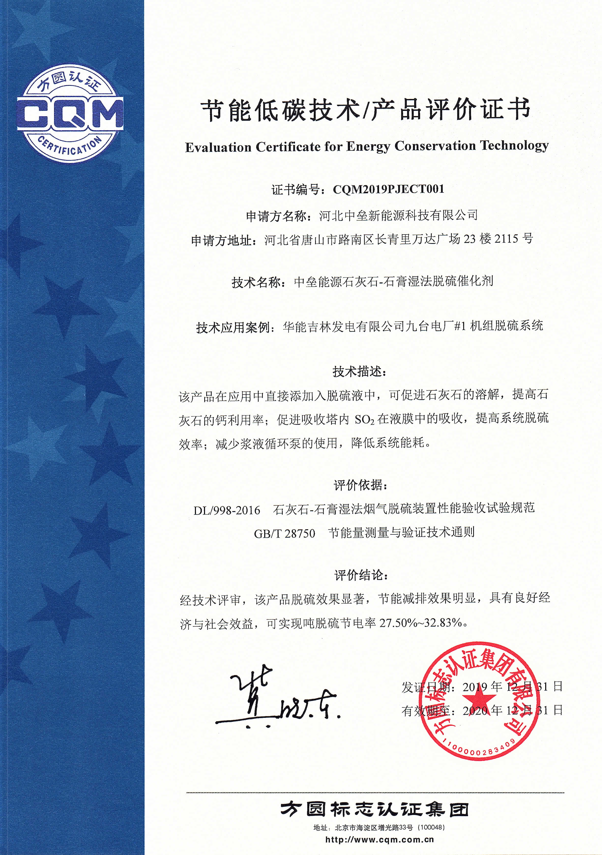 时间:2020年01月08日 近日,方圆集团依据《GB/T 28750 节能量测量与验证技术通则》对河北中垒新能源科技有限公司的石灰石-石膏湿法脱硫催化剂在华能吉林发电有限公司九台电厂#1机组脱硫系统的应用技术进行了评价。