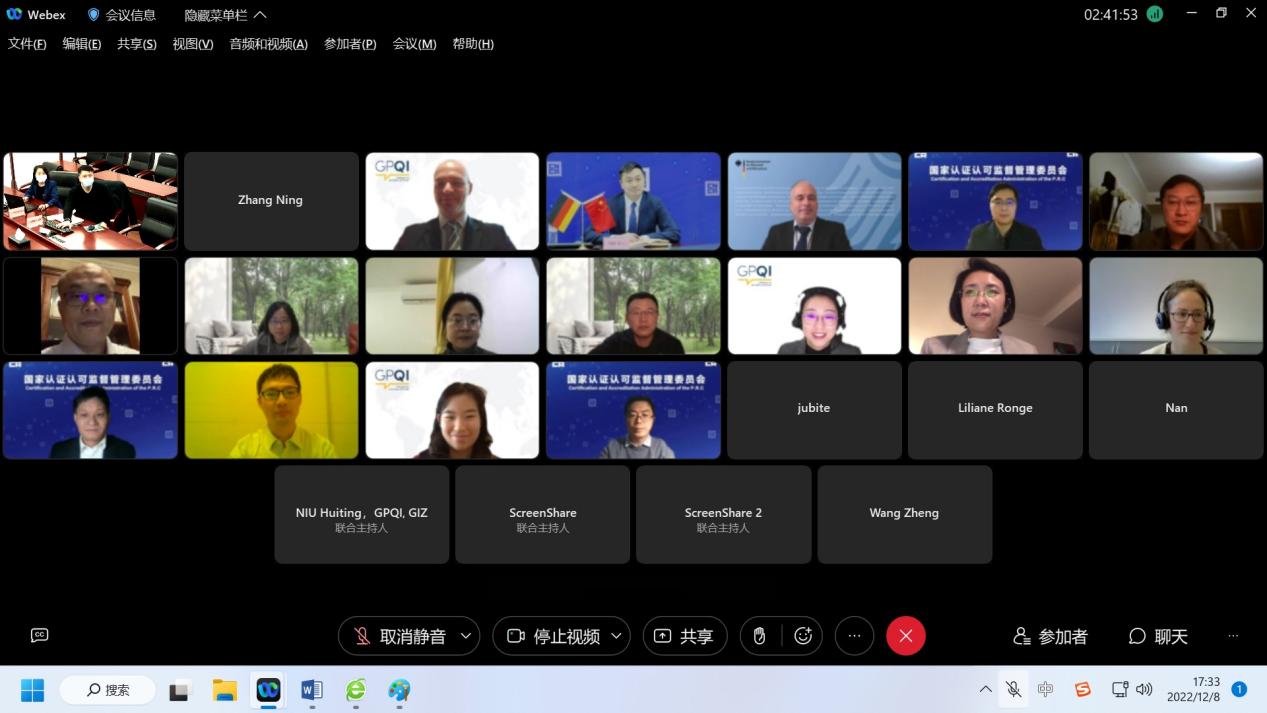 时间:2022年12月12日 2022年12月8日,中德合格评定合作工作组年度会议以视频方式召开。认证监督管理司国际处与德国联邦经济与气候保护部数字与创新政策司认可、计量、PTB、 BAM和DAkkS监管处携双方政府部门、企业、合格评定机构等代表与会。