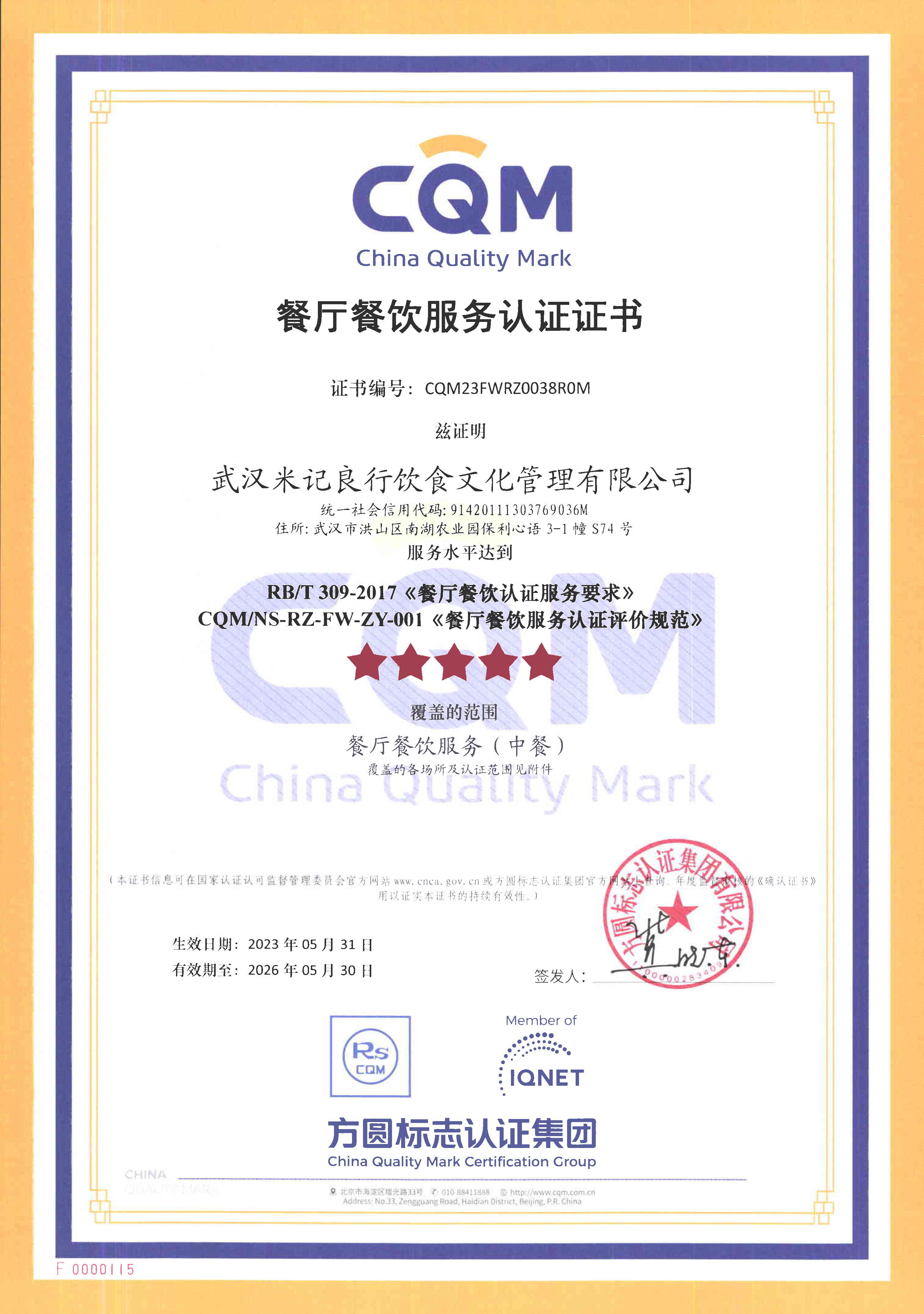 近日,方圆标志认证集团为武汉米记良行饮食文化管理有限公司颁发了五星级餐厅餐饮完美体育·(中国)官方网站-365WM SPORTS