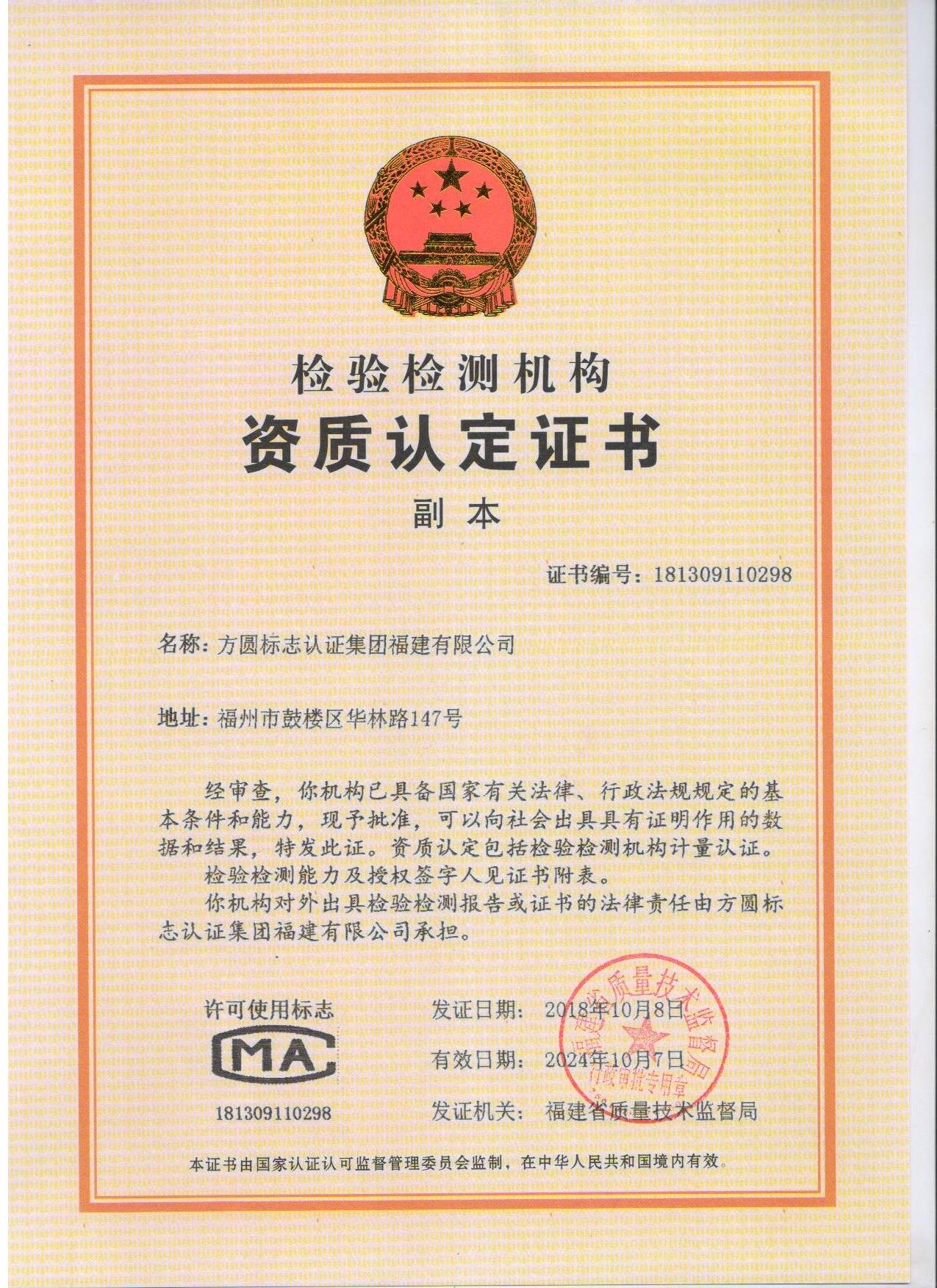方圆福建公司获得检验检测机构资质认定证书