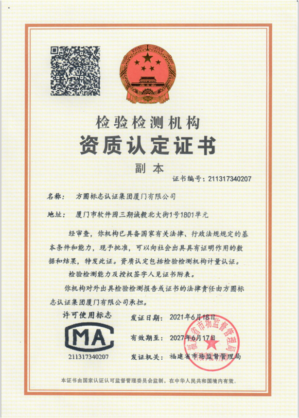 时间:2021年07月06日 近日,方圆厦门公司获得由福建省市场监督局颁发的“检验检测机构资质认定(CMA)证书”,取得照明及电量等节能相关领域的检验检测资质,此举是方圆厦门公司全面贯彻集团公司“标准、认证、检验检测三位一体”发展战略的重要举措。