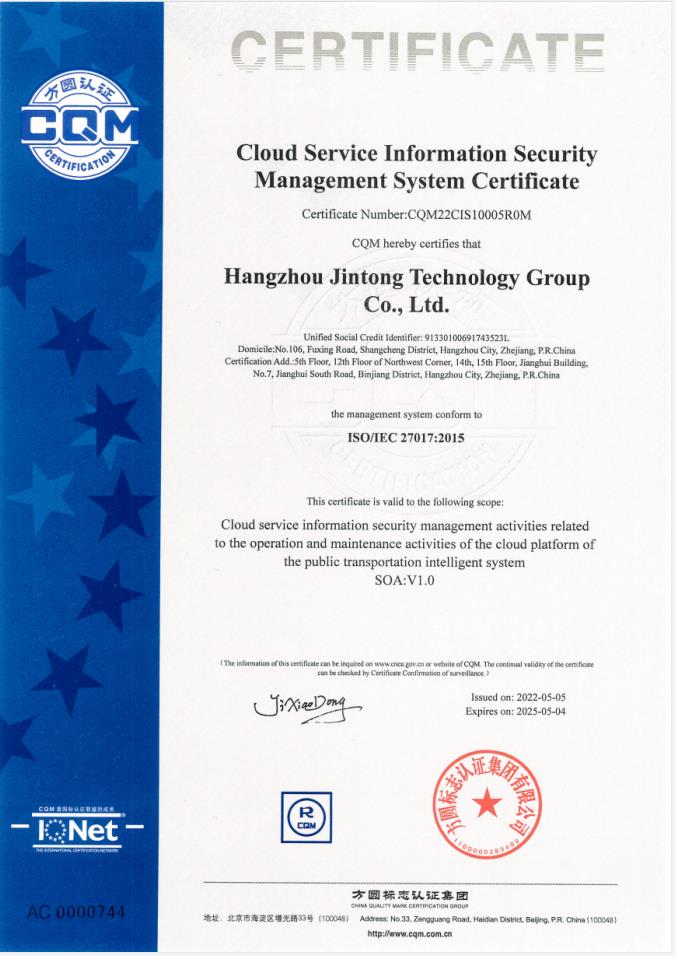 金通科技始创于2009年,由杭州公交集团控股,涵盖智能化软硬件开发、建设及整体运营服务,业务聚焦智慧单车、智慧公交和智慧停车,并以5G、云计算、大数据、AI等技术为驱动,为城市提供高品质、全方位的公共交通服务,让低碳理念深入人心,成为国内领先的公共交通全域数字化一站式解决方案提供商。基于自我要求及为外部提供信任的需求,杭州金通科技集团股份有限公司向我司提出了进行ISO/IEC 27017:2015云服务信息安全管理体系的认证申请。