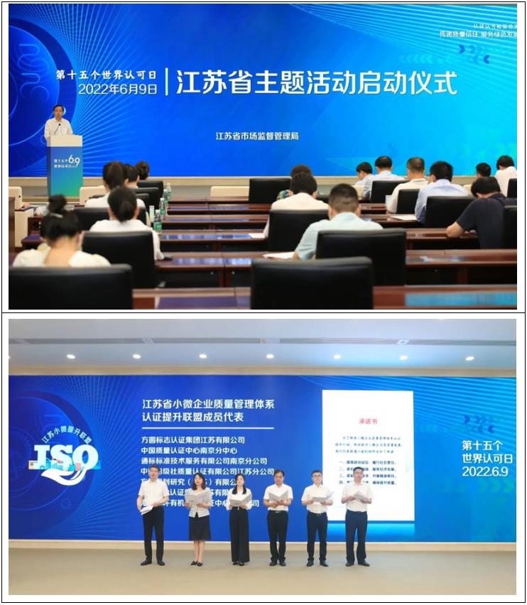 9日上午,第十五个“世界认可日”江苏省主题活动启动仪式在南京举办。启动仪式上,方圆规划研究(江苏)有限公司总经理陆凯作为江苏省小微企业质量管理体系认证提升联盟成员代表,向社会作了服务“稳企强链”公开承诺。