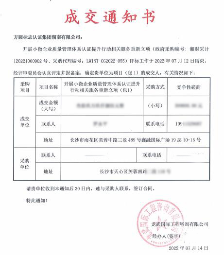 方圆湖南公司成功中标湖南省市场监督管理局小微企业质量管理体系认证提升行动相关服务项目