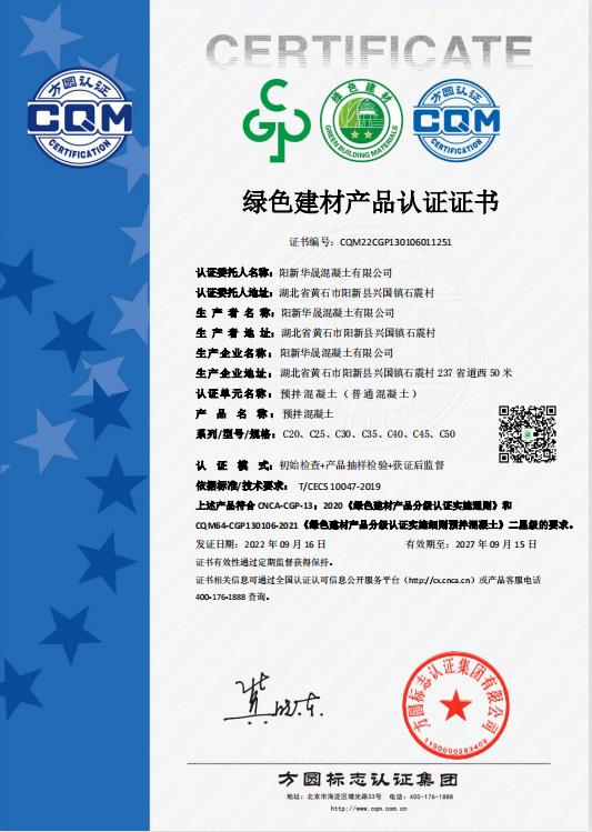 阳新华晟混凝土有限公司是黄石市生产预拌混凝土的代表性企业之一,企业在通过绿色生产评审后,基于自我更高要求及为外部提供信任的需求,向方圆认证提出了对预拌混凝土(普通混凝土)产品进行绿色建材产品认证的申请。