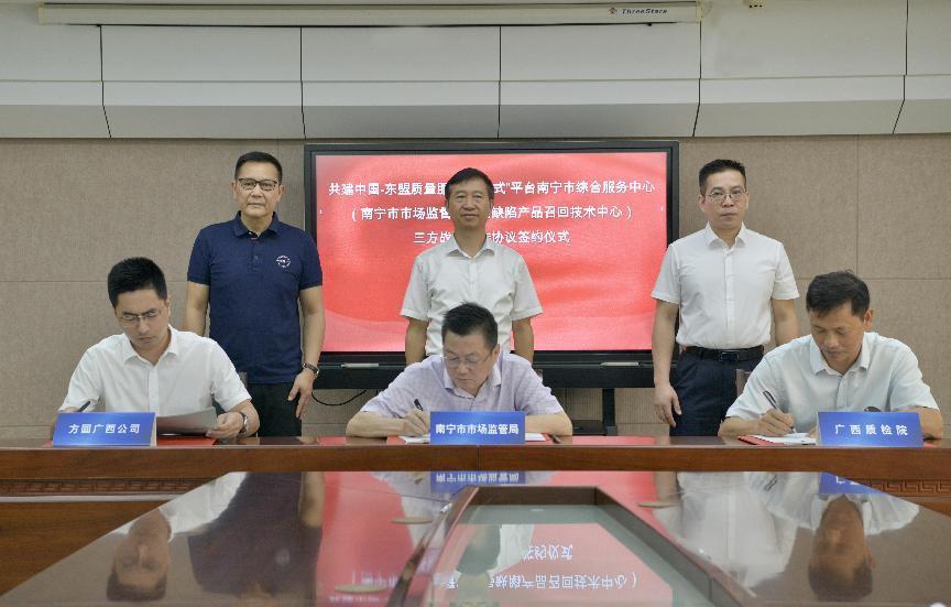 时间:2022年09月28日 9月26日上午,南宁市市场监管局、广西质检院、方圆广西公司在广西质检院高新区分部签署三方战略合作协议,共同建设中国-东盟质量服务“一站式”平台南宁市综合服务中心和南宁市市场监督管理局缺陷产品召回技术中心(以下简称“综合服务中心”),为南宁市中小企业提供优质的质量技术综合服务,落实助企纾困服务,助力打造一流营商环境。签约仪式后,三方负责人共同为综合服务中心揭牌。