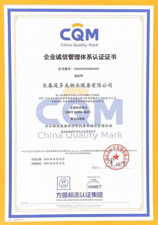 长春庭多美物业服务有限公司高度重视企业诚信管理管理体系建设,严格按照GB/T39950-2015《企业诚信管理体系》要求开展体系的建设和运行工作。2023年2月,审核组经过两阶段的认真审核,对其系统化开展企业诚信管理、推行企业诚信落地、提升企业诚信绩效等方面给予高度评价,一致认为该公司企业诚信管理体系符合认证标准要求,体系运行规范有效。获得企业诚信管理体系认证证书,有效提升了公司品牌宣传价值,增加投标资格,有效防范企业信用风险。
